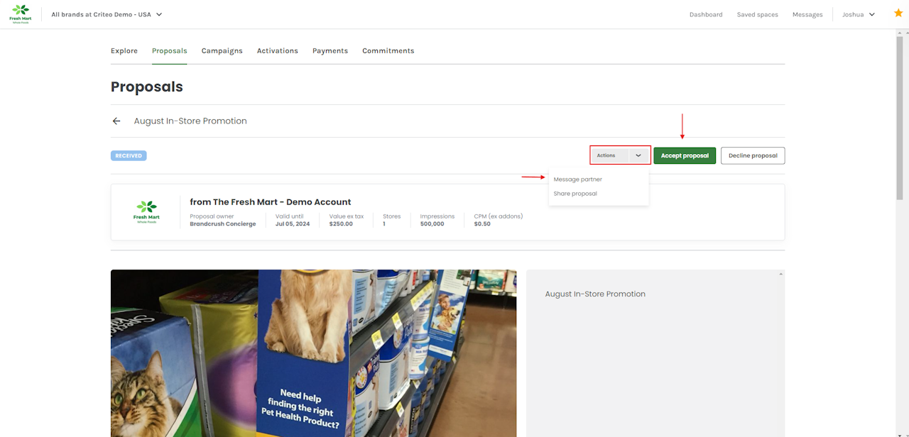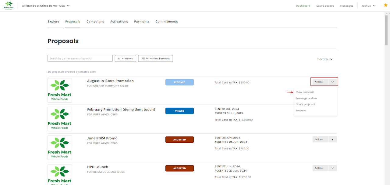 - You can click on the Actions dropdown to message the partner if you have any questions or need to make any changes, or share the proposal internally by clicking on Share proposal.