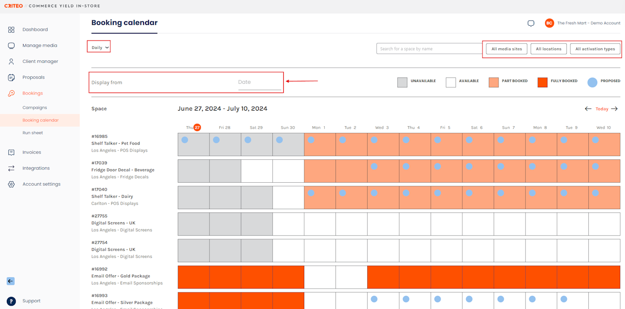 - Sort your Booking Calendar by All media sites, All locations or All activation types by selecting the corresponding filter.