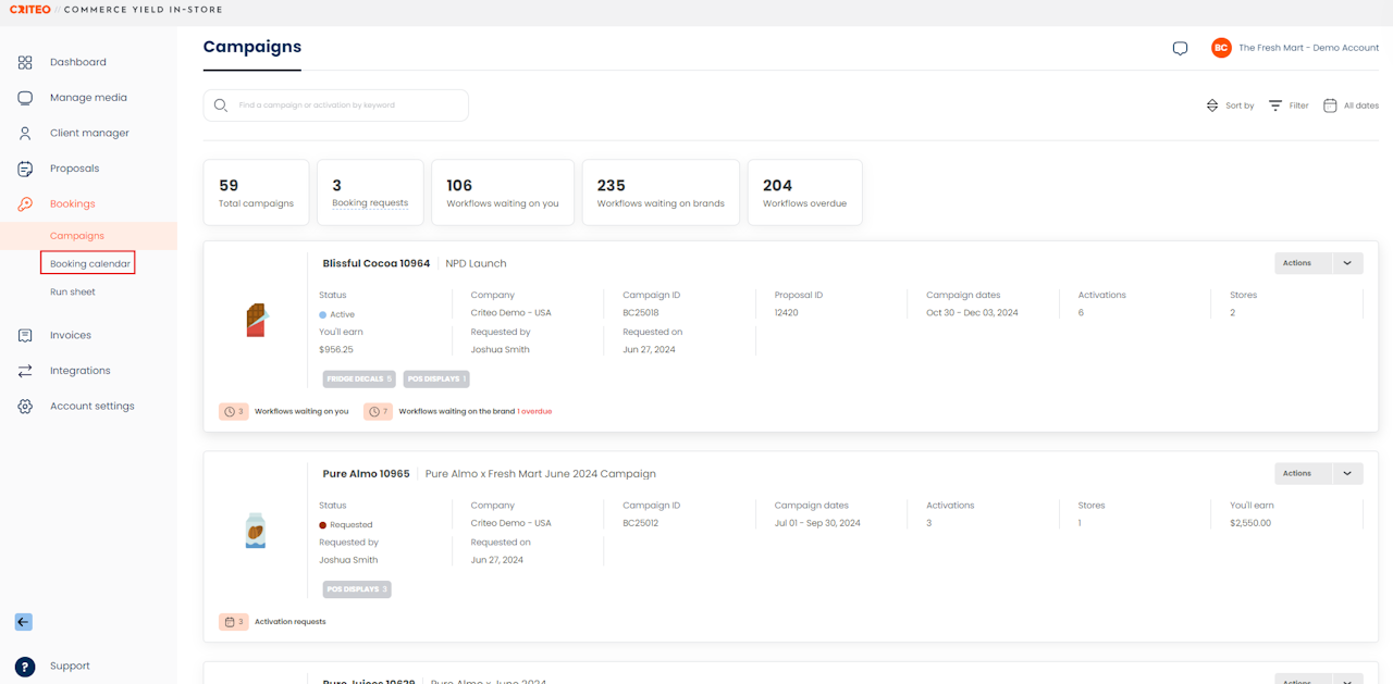 The Booking Calendar provides an overview of your bookings and availability based on promotional periods and financial years.