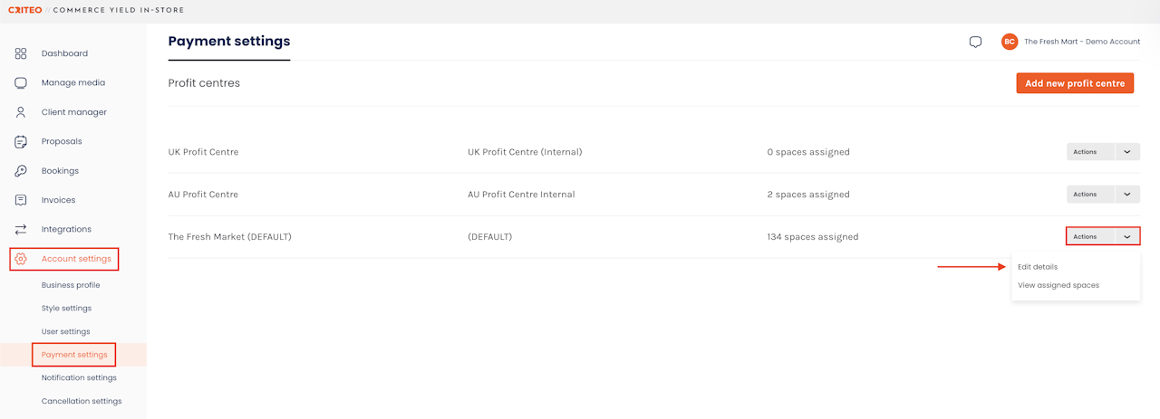 - Select Account Settings, then Payment settings. Next, click the Actions drop down menu and select Edit details.