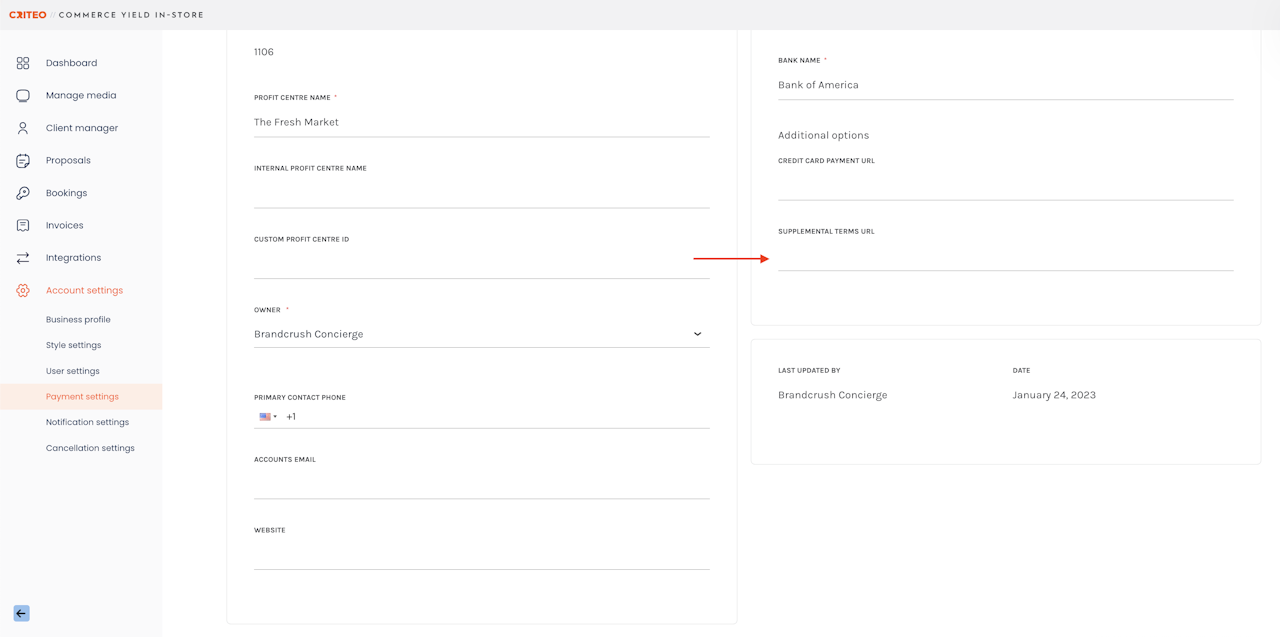 Media Owners can add a URL link for additional terms that Media Owners need to agree to when confirming a booking. This feature is available to users that have profit centers enabled.