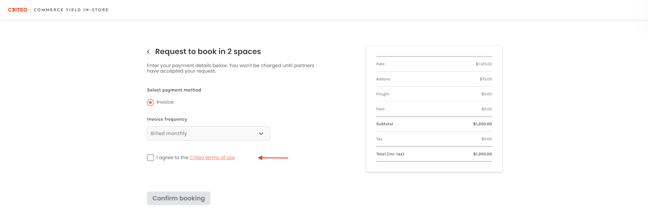 - When a Media Buyer confirms their booking with you after completing the required workflows and they click Request to book, the supplemental terms link will be displayed. The Media Buyer must tick the box to agree with the terms, in order to confirm the booking.