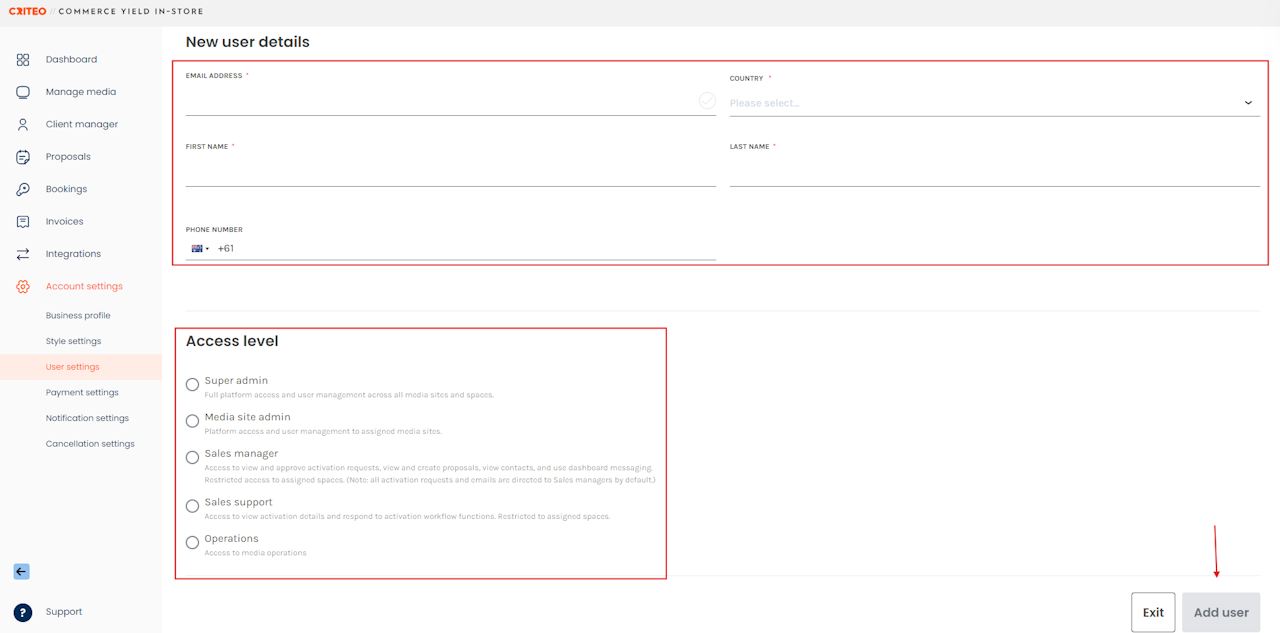 - Fill in the new user's details as shown below and select their Access level.