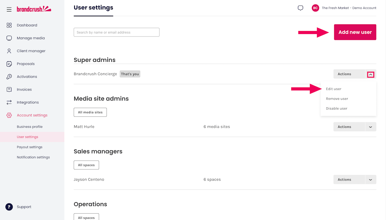 2. Media Site Admin — this user has full platform access, with management restricted to the spaces relating to specific media site/s.