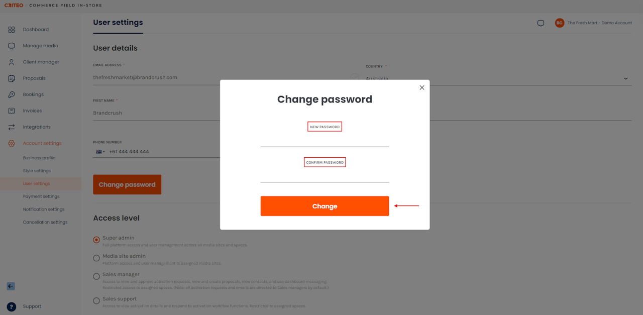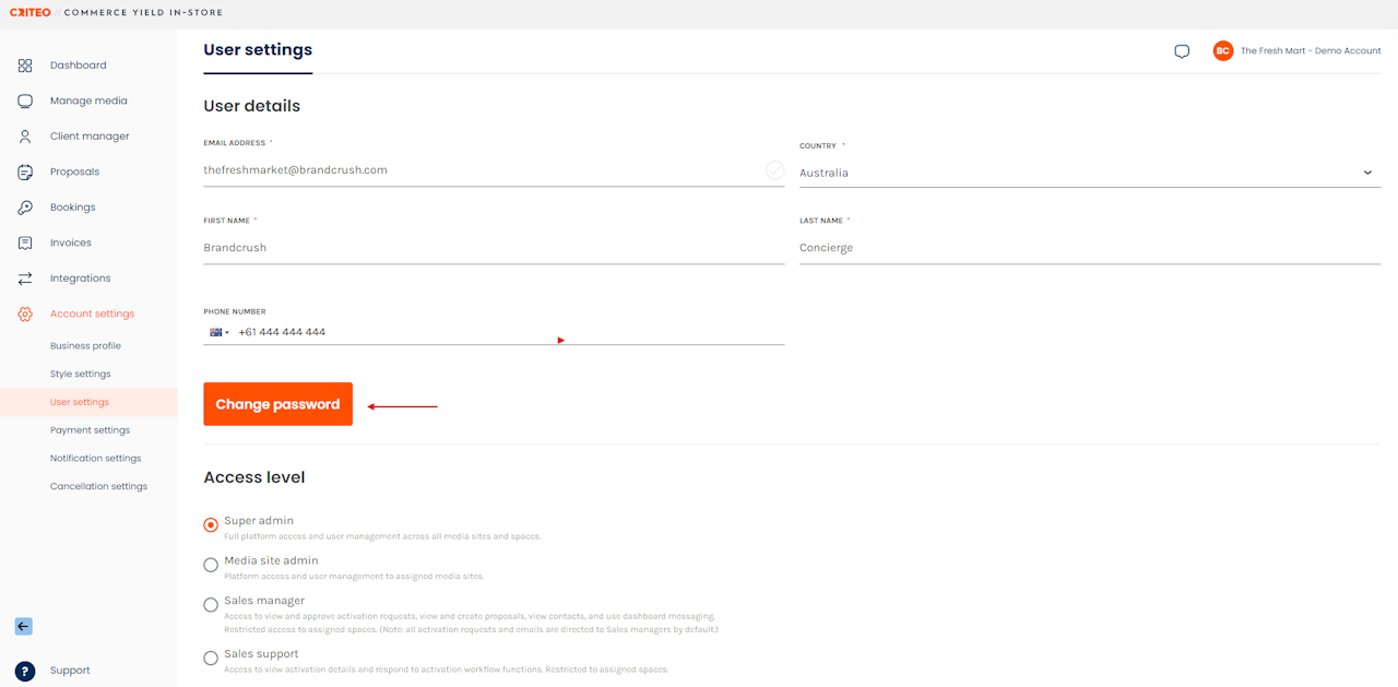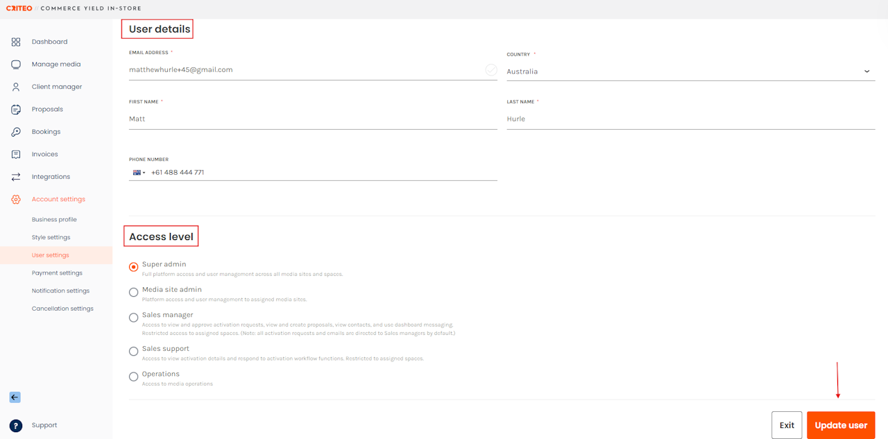 - Edit the user's Access level by selecting the relevant radio button and clicking Update user.