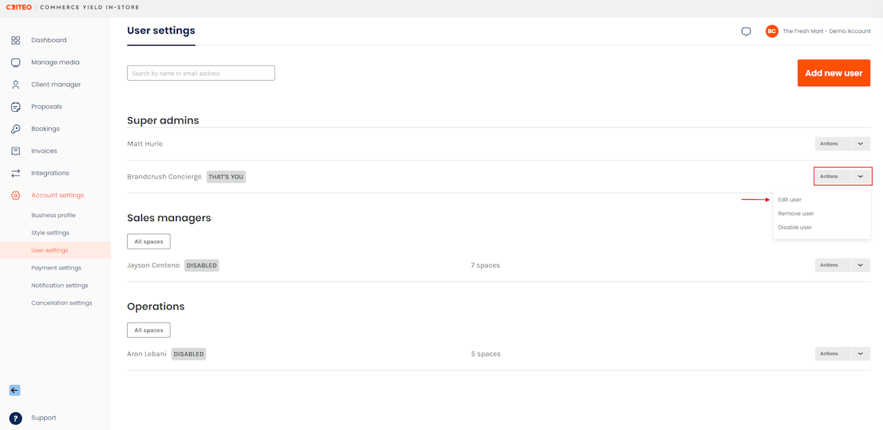 - To edit an existing account, including names, email addresses, and access levels, select the corresponding Actions dropdown menu on the relevant user.