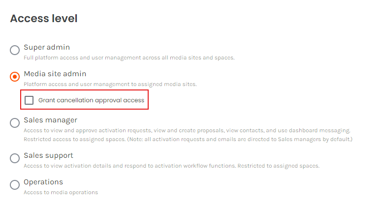 Super admins can cancel an activation, or a Media site admin/Sales manager with Grant cancellation approval access enabled (this is configurable by a Super admin in the User settings section.