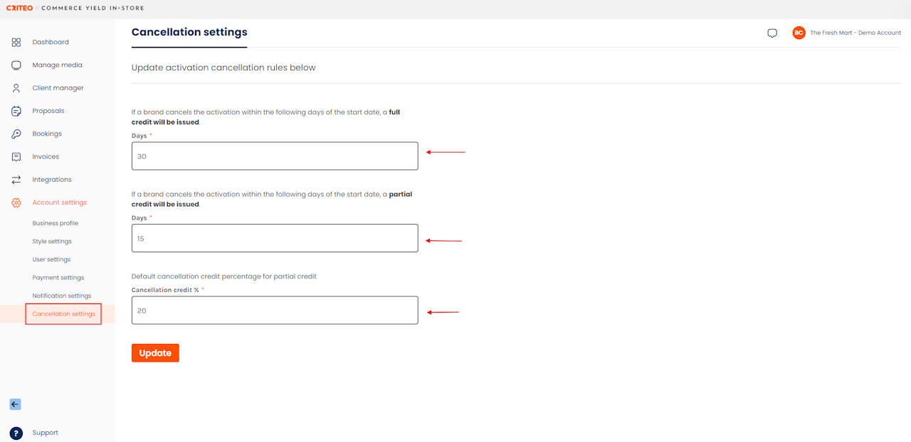 2. Fill in the three fields outlining the cancellation terms. These terms will be applied to all bookings. Click the Update button to confirm cancellation settings.