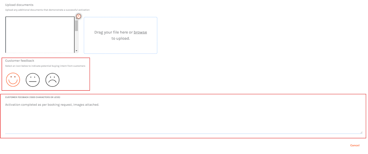 - Complete the report by uploading the required amount of activation images, selecting a smiley-face icon to indicate the key consumer sentiment, and providing feedback from customers.