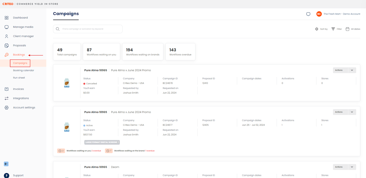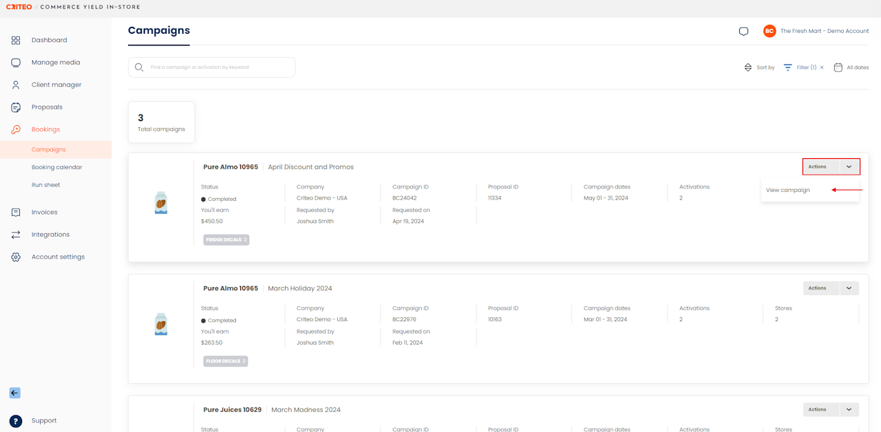 - Locate the relevant Campaign, then click on the corresponding Actions dropdown menu and select View campaign.
