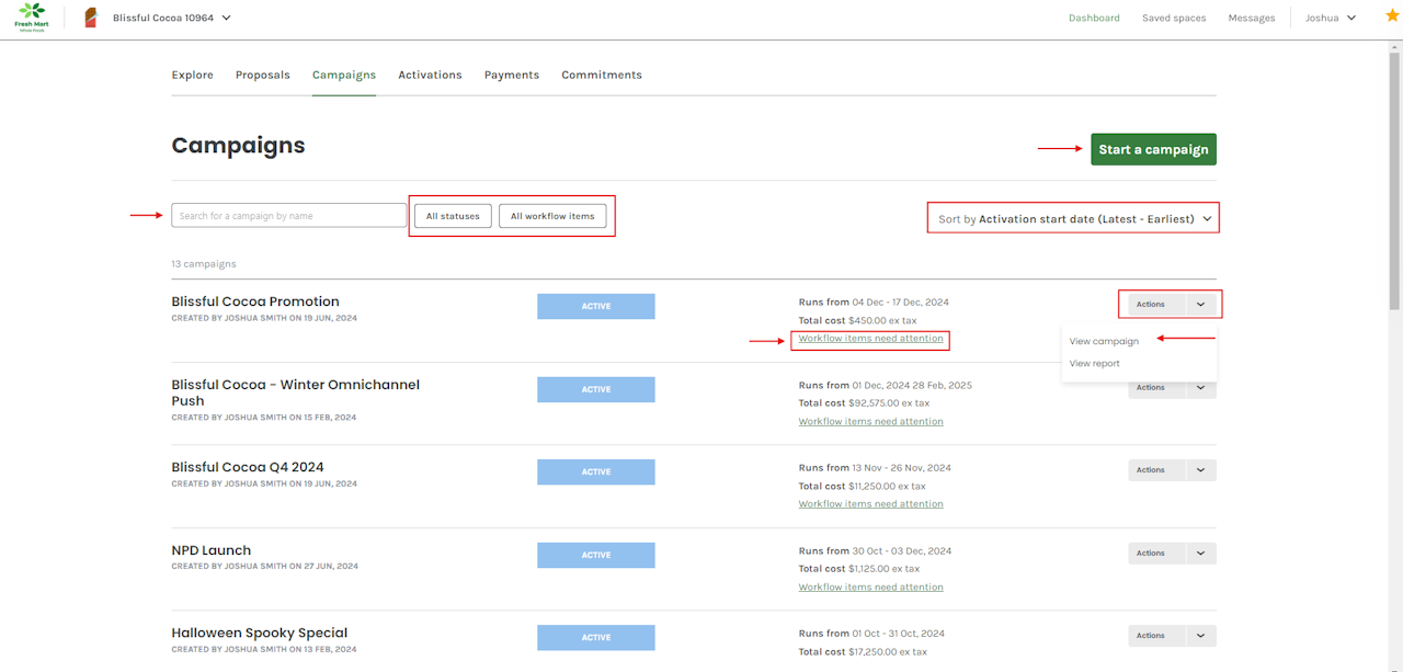 - Filter by Campaign or Workflow status by using the All statuses and All workflow items buttons.