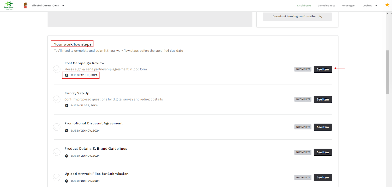 Media Owners assign Workflow items to Media Spaces for Media Buyers to complete across the duration of a Campaign.