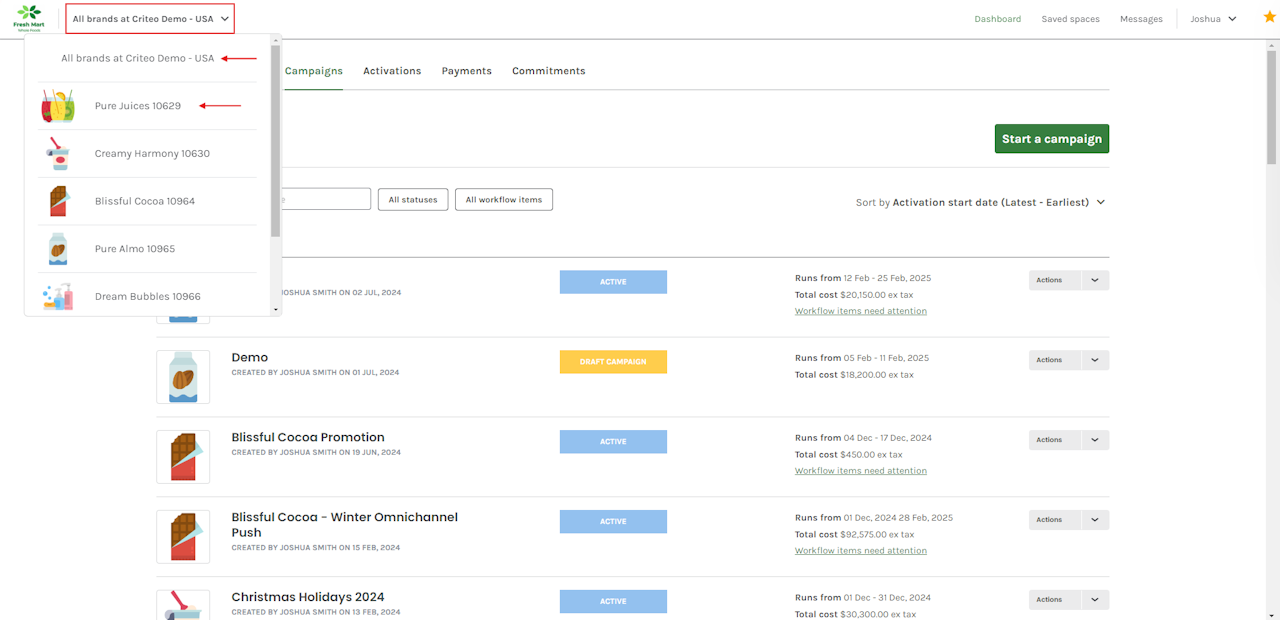 - Alternatively, view your Campaigns and Workflow items across all Brand profiles.