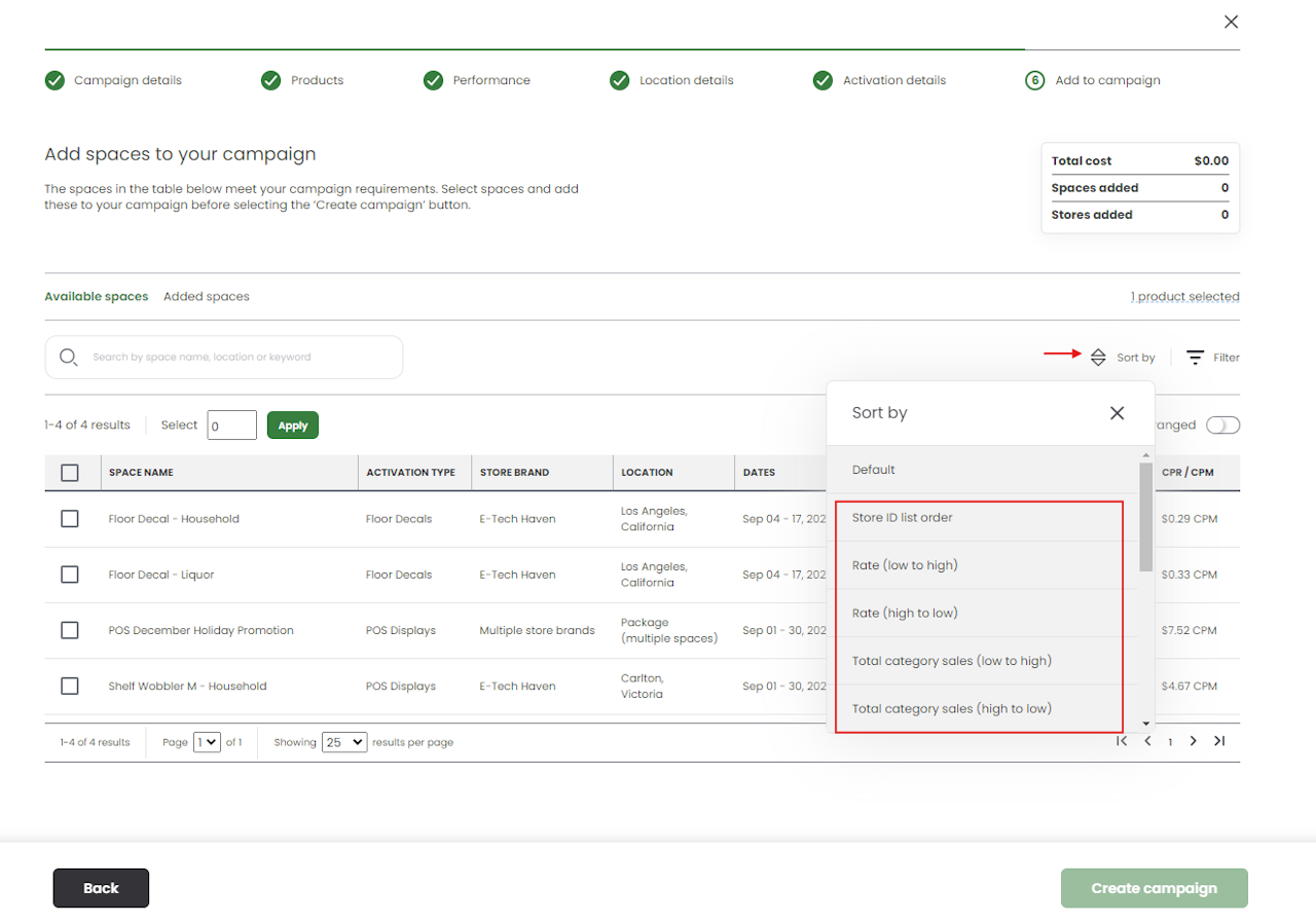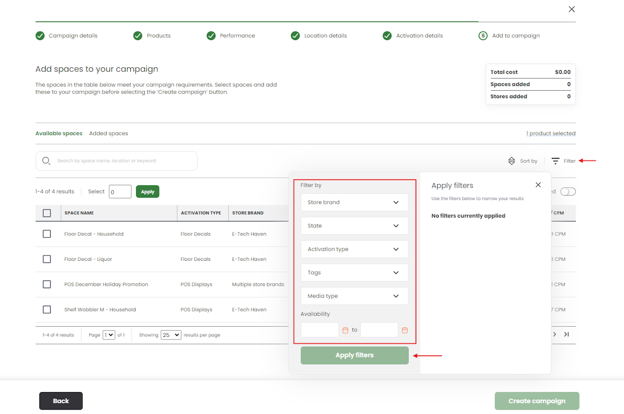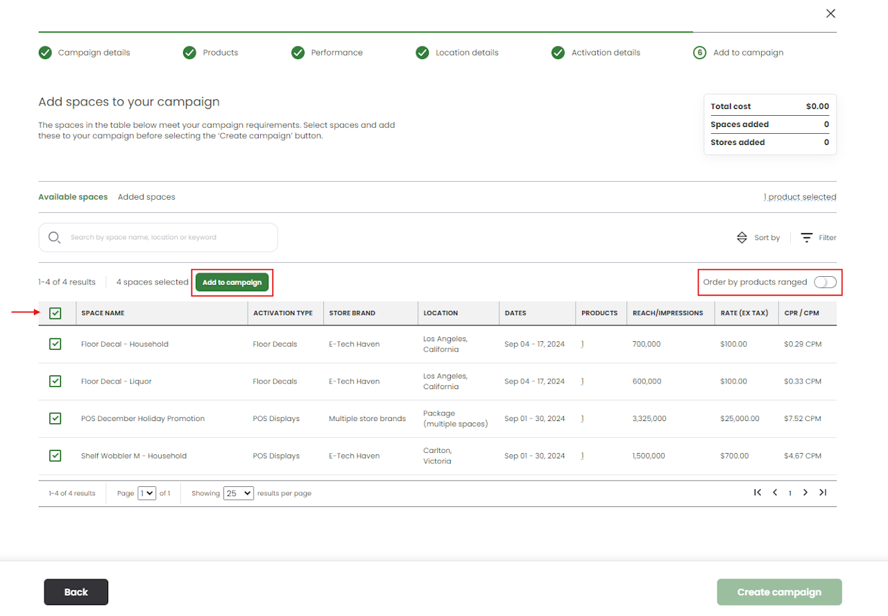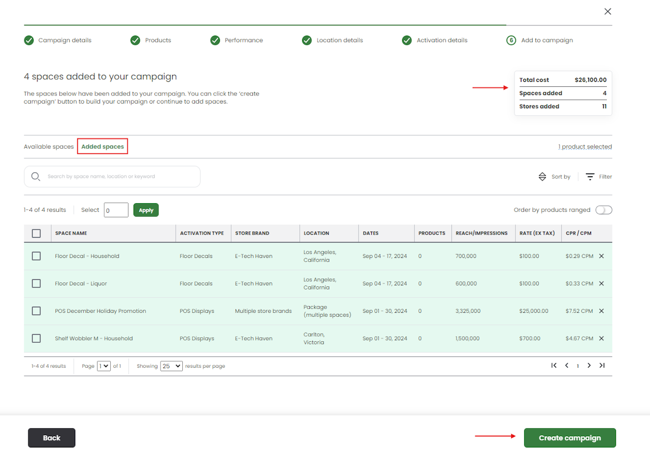 - The Total cost, Spaces added and Stores added will calculate as you add and remove spaces from your campaign, which can be seen on the top right of your screen.
