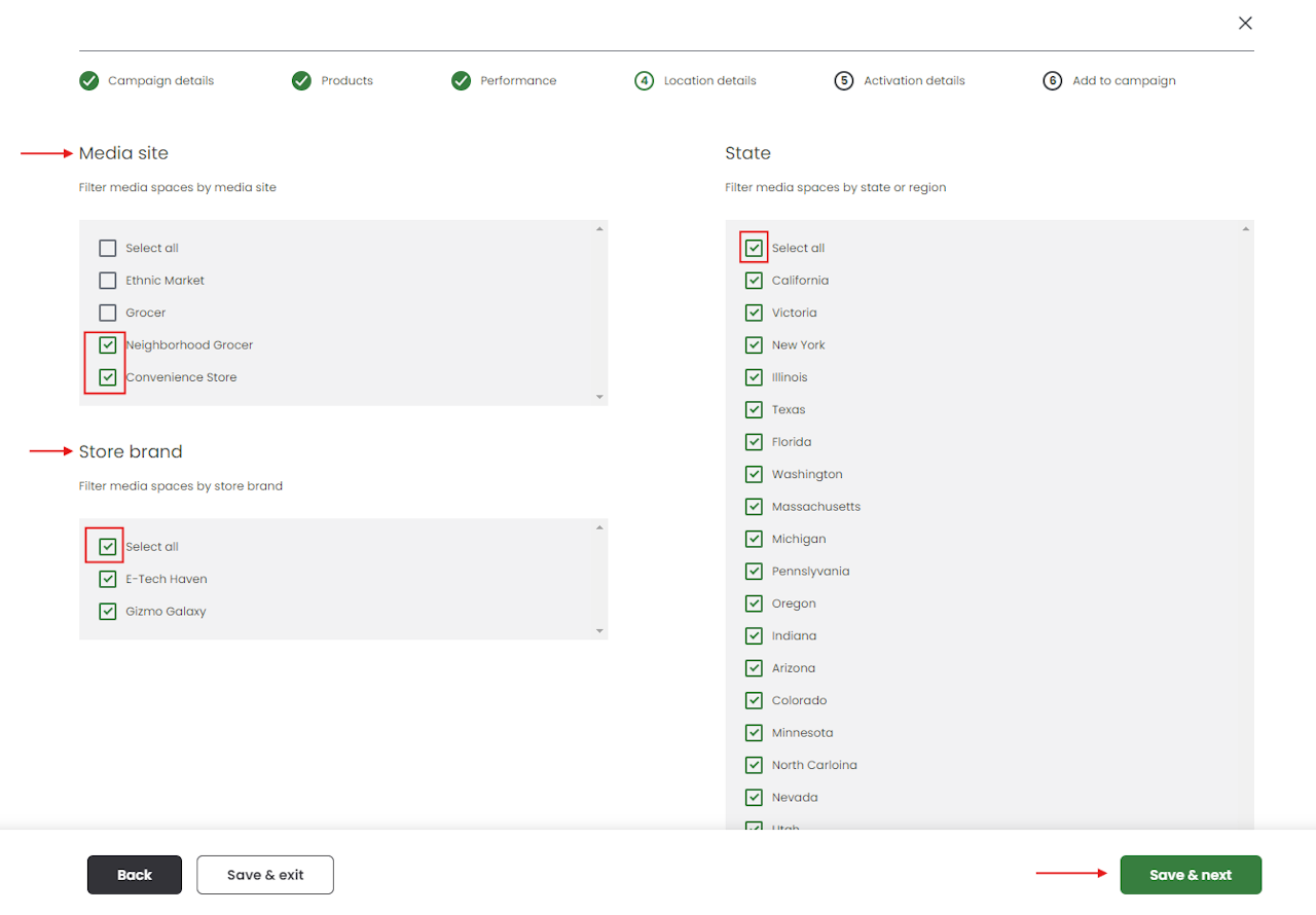 - You can then filter the Media space options by state or region, based on your Media site and Store brand selections. Select some, or all of these by checking the Select all checkbox - depending on your requirements for this campaign.
