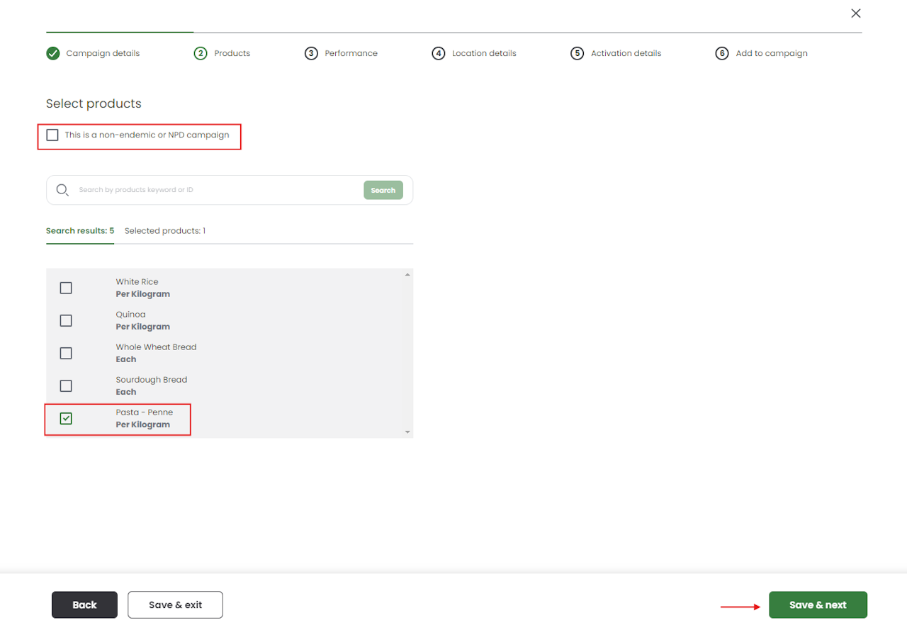 - Alternatively, you can select the This is a non-endemic or NPD campaign checkbox if the product that you'd like to promote is not available on the shown Search results, OR if this is will be the first time that you will be activating with this Media Owner.