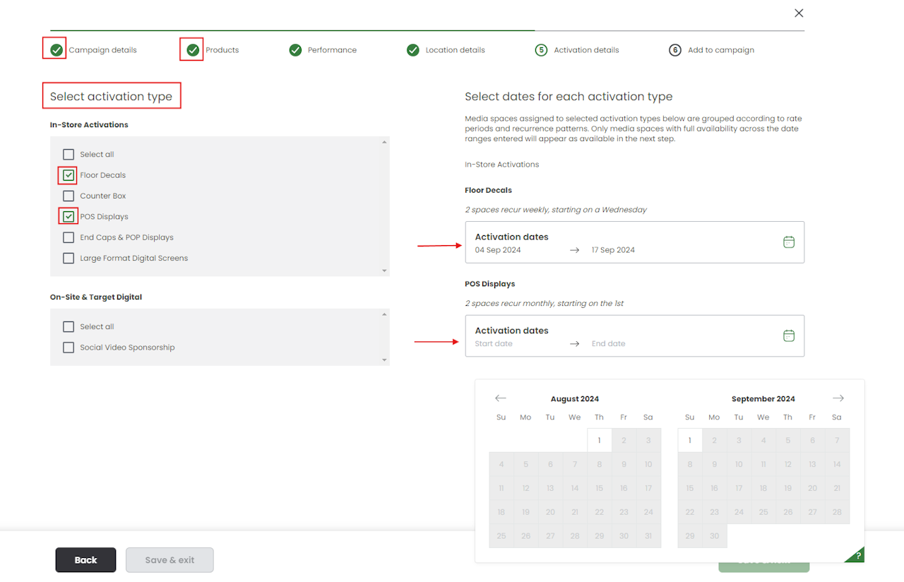 - If there are dates that are greyed out, this means that these don't fall within the Media Owner's booking parameters. The example shown below, indicates that the POS Displays are only bookable on a monthly basis. If this doesn't align with your requirements, you can simply untick this checkbox and reselect a new Activation type if needed.