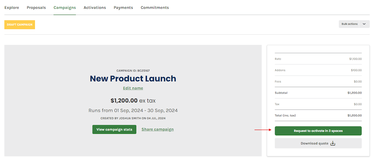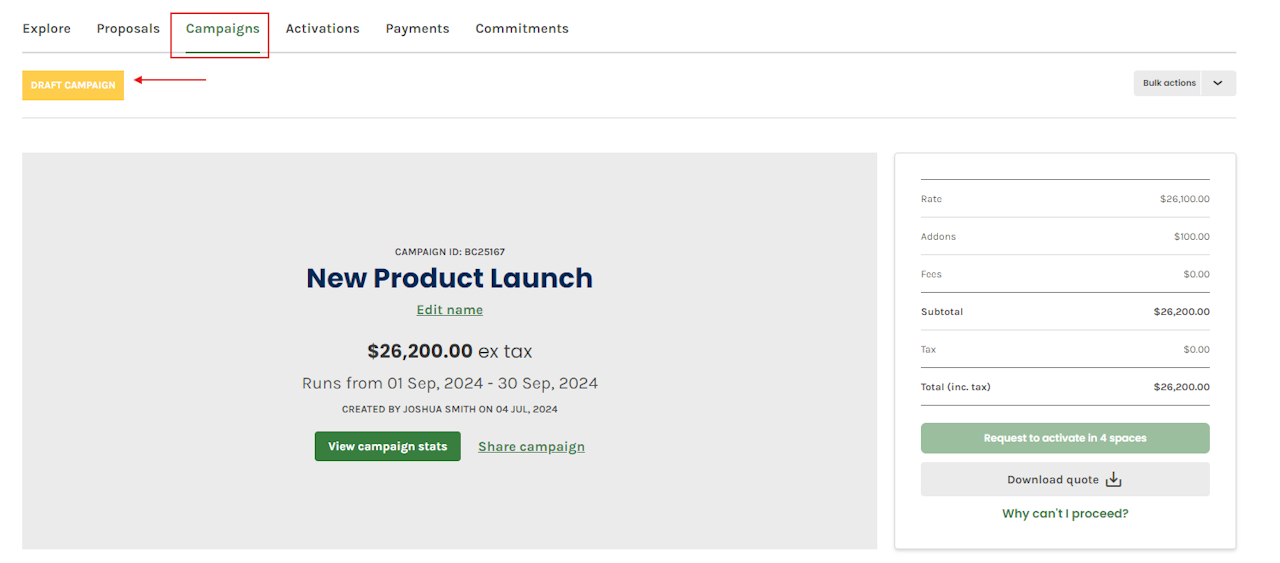 - The campaign status will change from Draft to Requested, until the Media Owner accepts or declines.