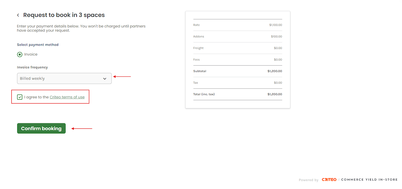 - You'll then be redirected to the checkout screen, where you can select your Invoice frequency by clicking on the corresponding dropdown menu. You can select Billed weekly, Billed monthly, or Billed in full - depending on the Media Owner's configuration settings.