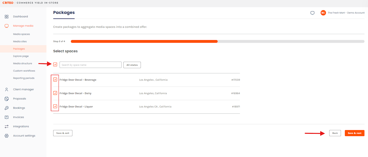- Select the spaces you want to include in your Package by ticking the corresponding box.