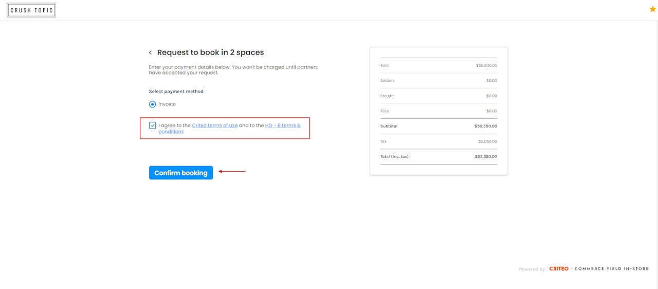 - Review and tick the terms of use checkbox and click on Confirm booking.