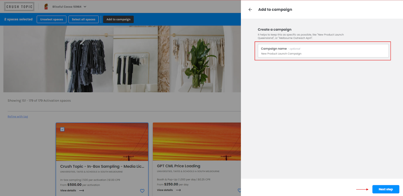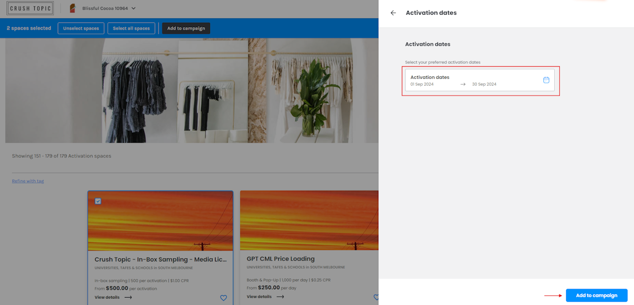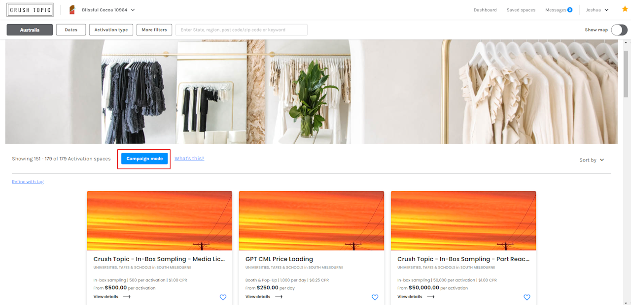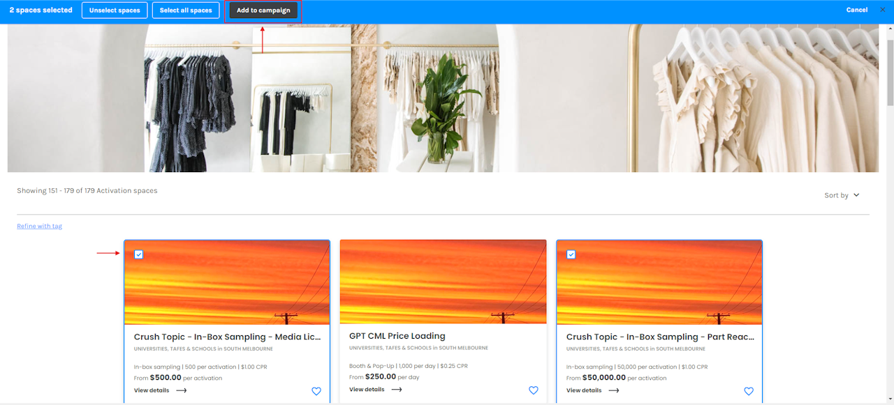 - Click on Campaign mode to select multiple Media spaces at a time, to add to your draft campaign.