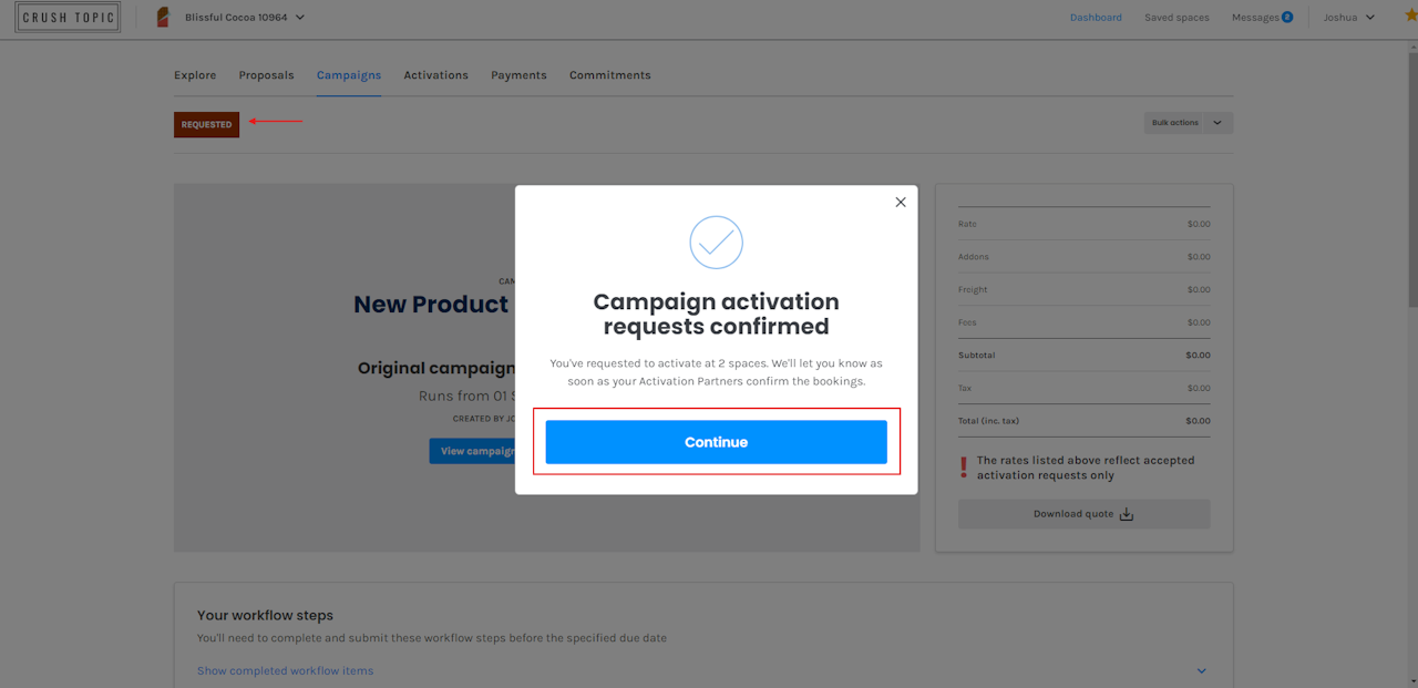 - The campaign status will change from Draft to Requested, until the Media Owner accepts or declines.