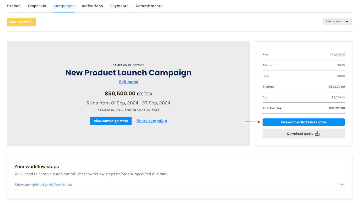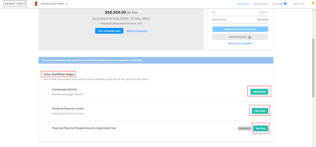 - Some Media Owners request workflow steps to be completed before submitting your campaign request. Complete these by scrolling to the Your workflow steps section to complete the requirements.