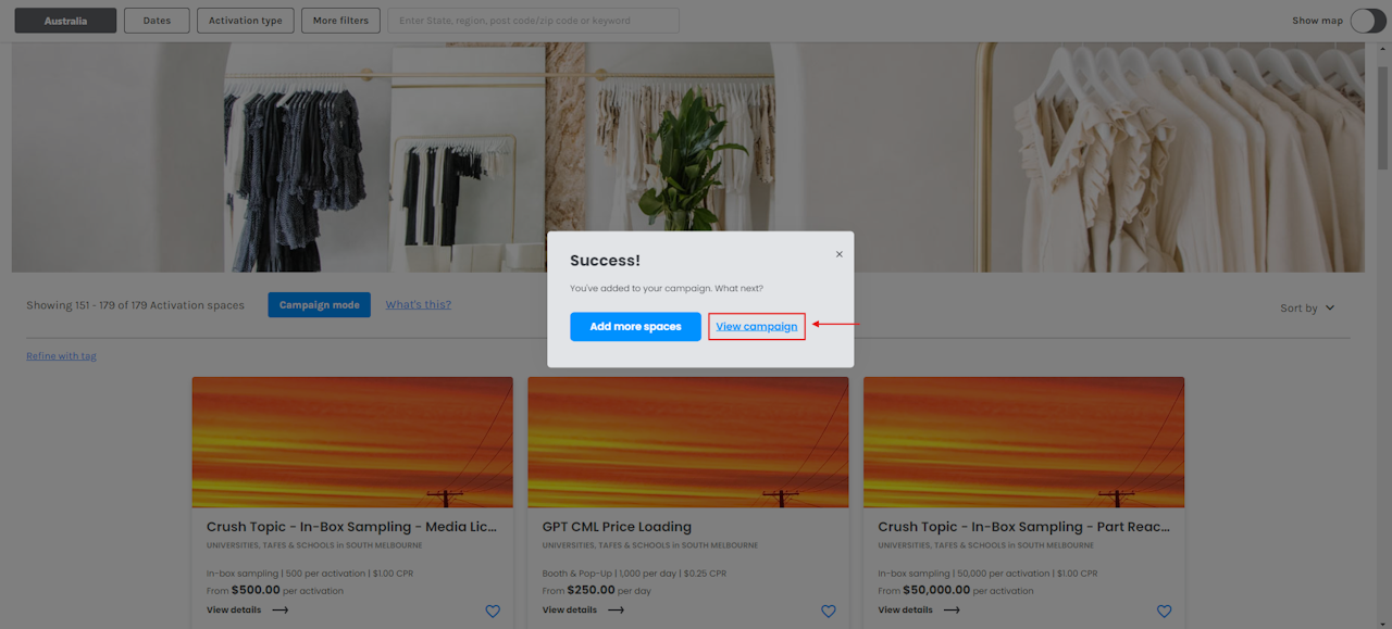 - Click View Campaign, or Add more spaces if you would like to add more Media spaces to your draft campaign.
