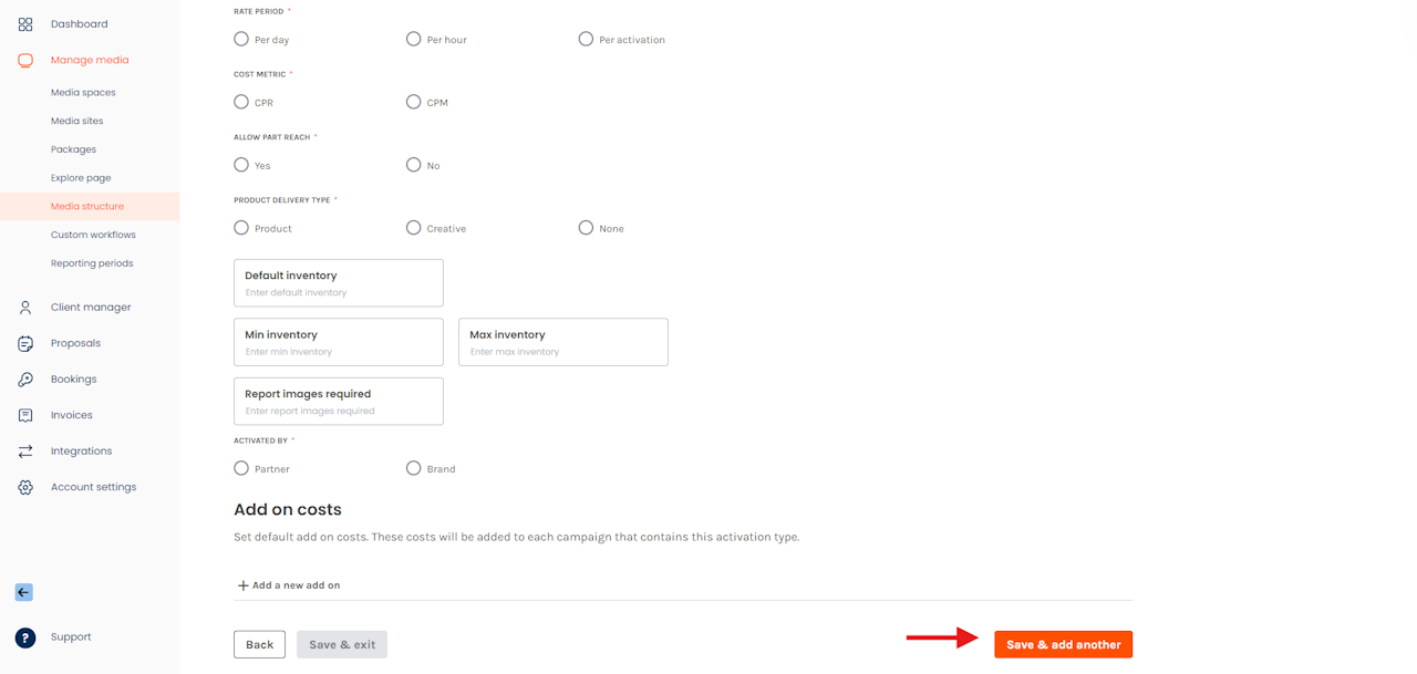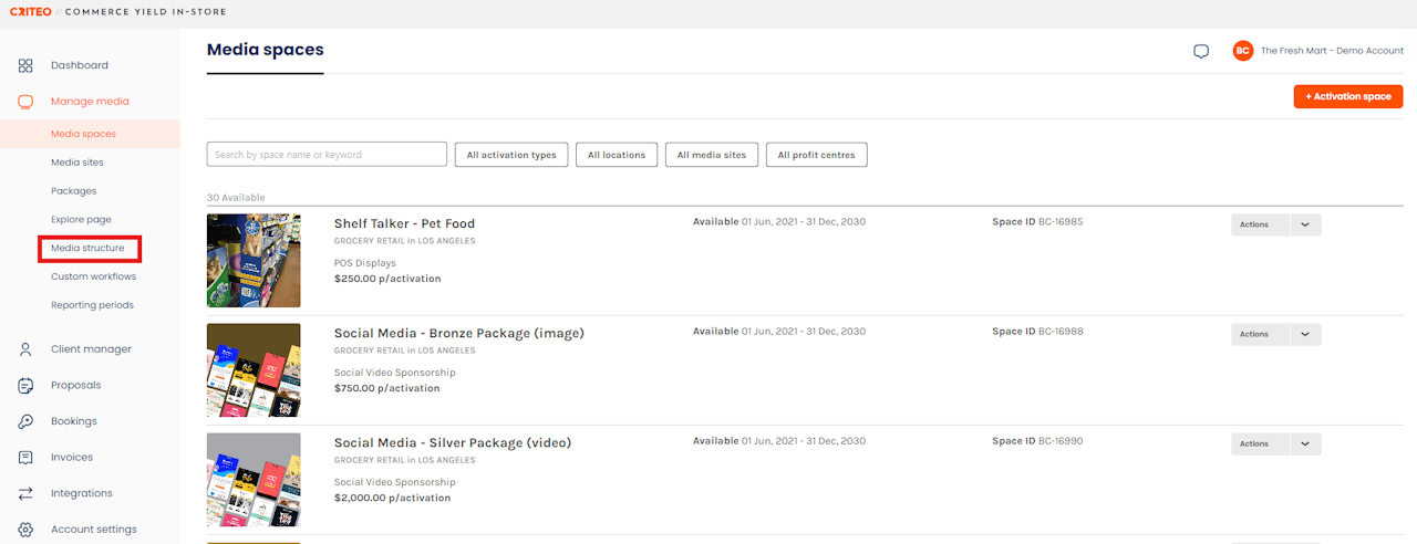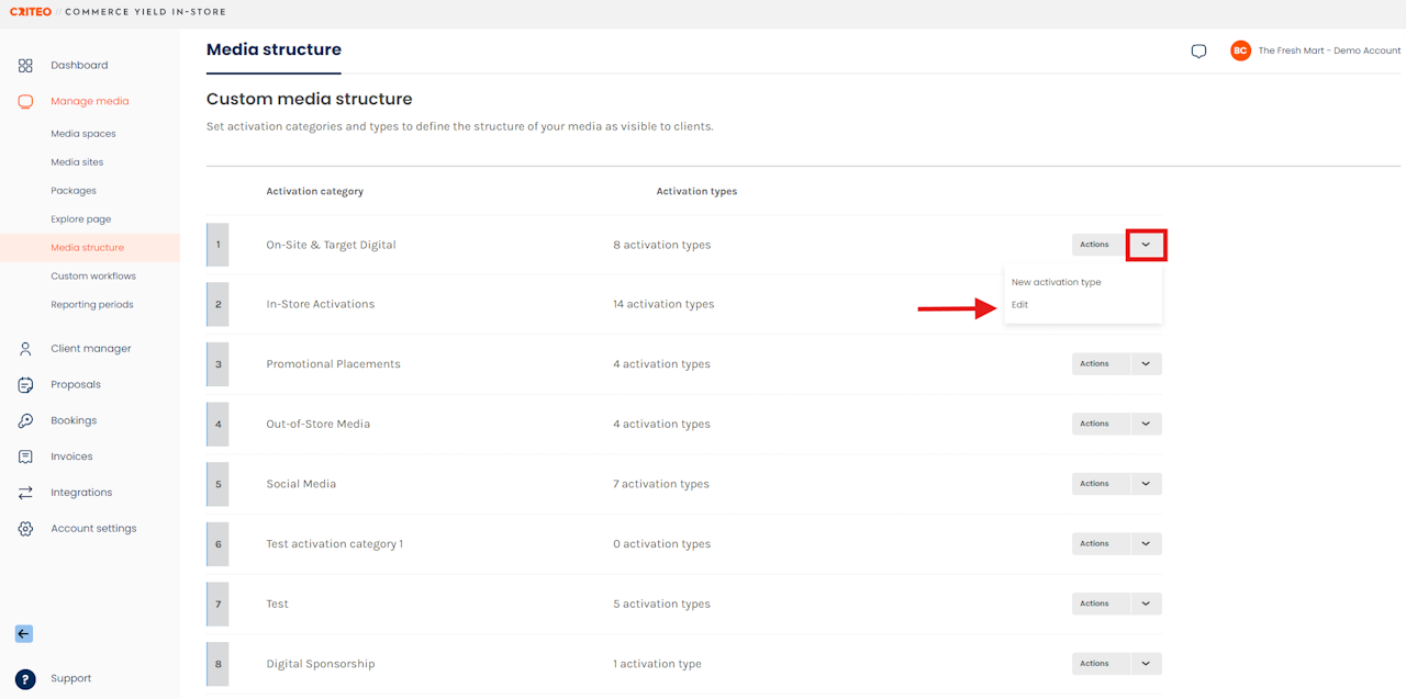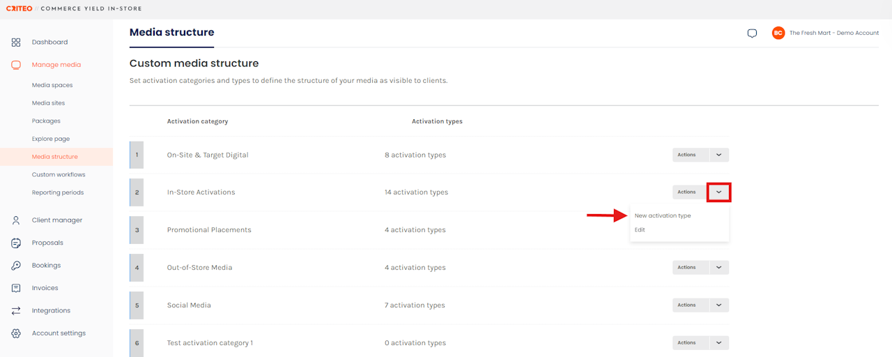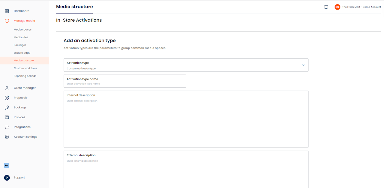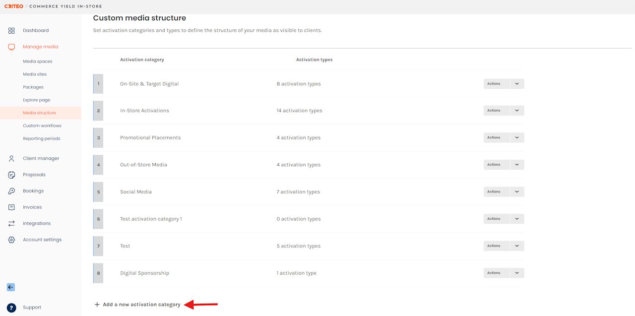 - Activation Categories: represent the umbrella category that media can be categorized by. Example Activation Categories may be "In-store", "Digital" or "Out-of-Store".