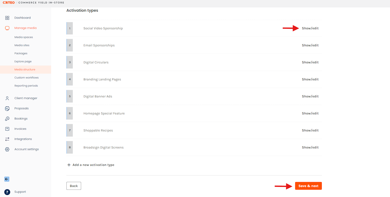 - To edit an existing Activation Type, select the relevant Category and click Show/edit on the corresponding Activation.