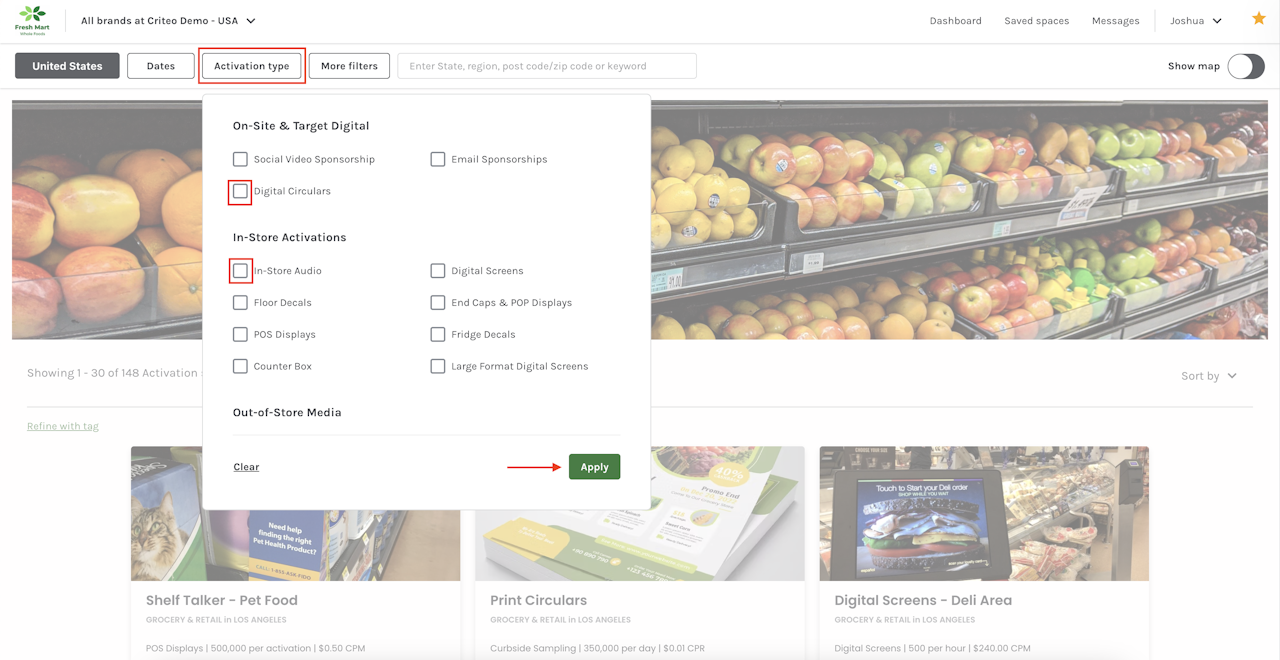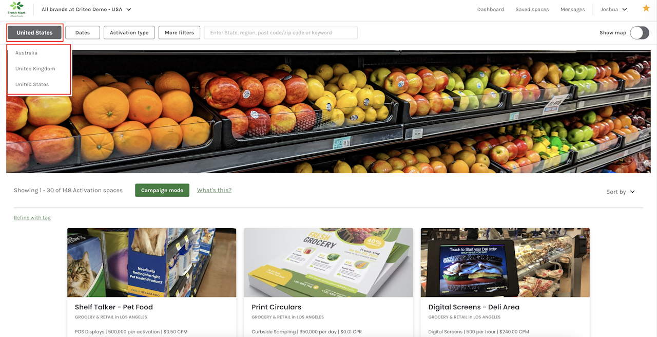 - The Country filter allows you to search for media spaces across Australia, United Kingdom and the United States.
