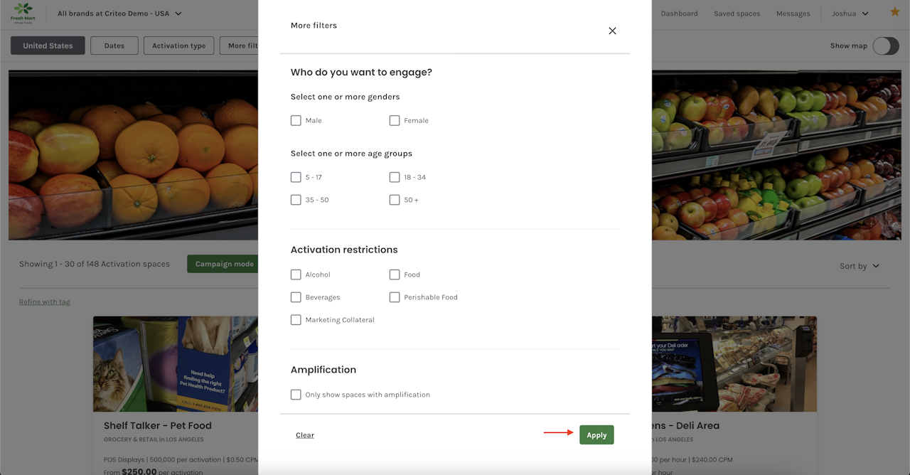 - The More filters option allows you to search for media spaces that are targeted towards a specific gender, age group, business type, restrictions and spaces that offer social media amplification when booking.