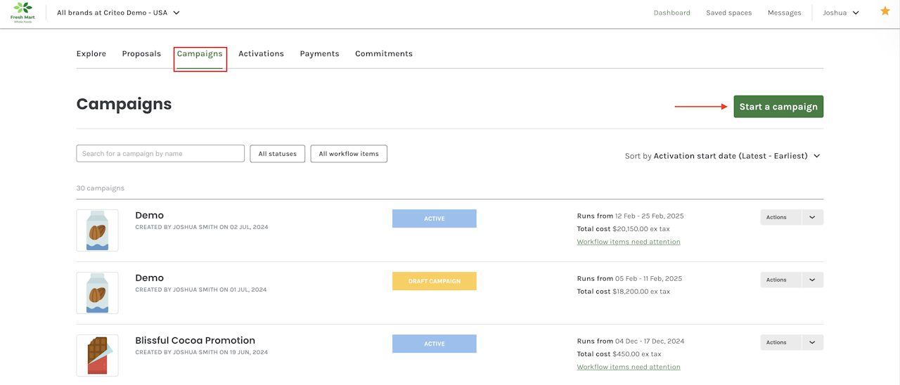 - From the Campaigns tab, click Start a campaign.