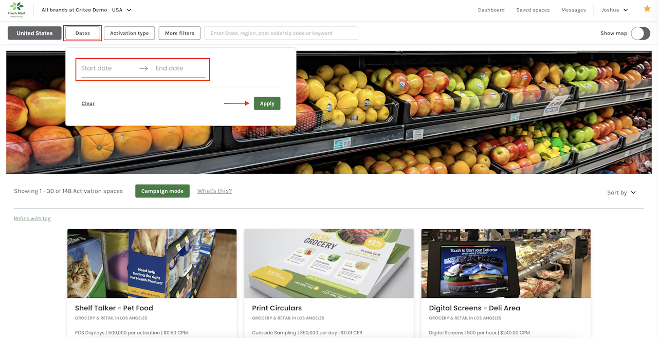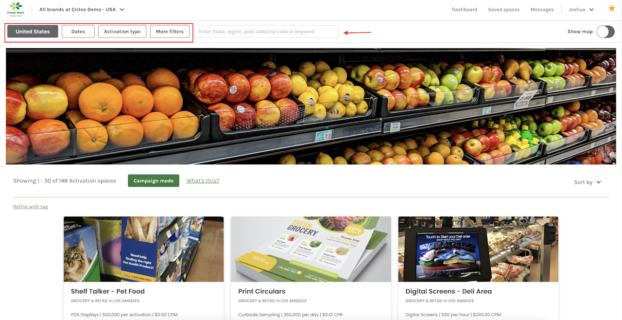- Use the search bar to search for spaces by keywords, postcode or region, or filter by Country, Dates, Activation types, or More filters using the corresponding button.