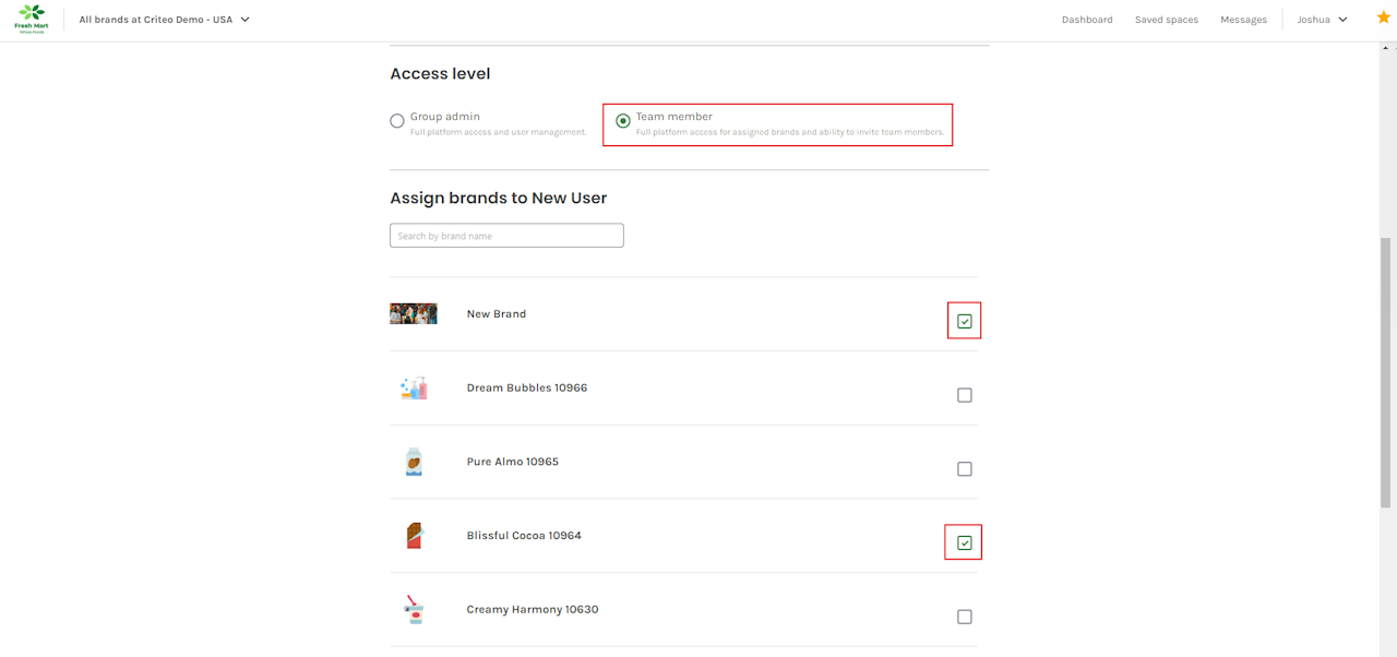 - If the user is a Team Member, assign Brand Profiles to the user. The user will only have access to activity regarding the Brand Profiles you assign them.