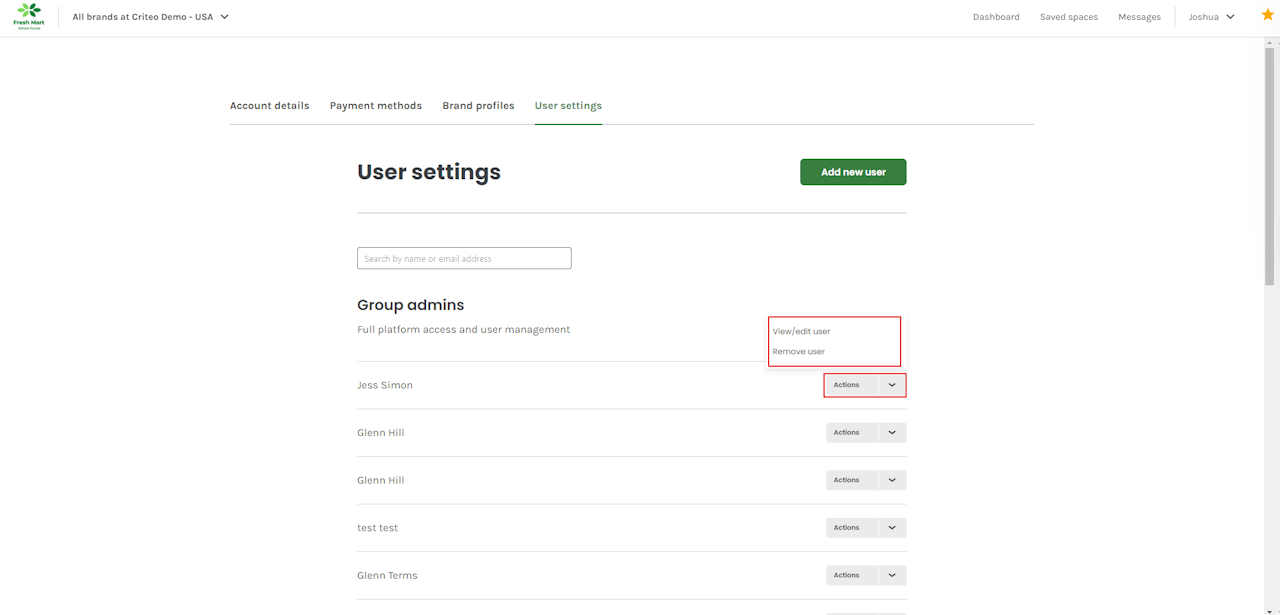 - Click the corresponding Actions dropdown menu next to a user to edit or remove an existing user from your account (only Group admins will have access to this).