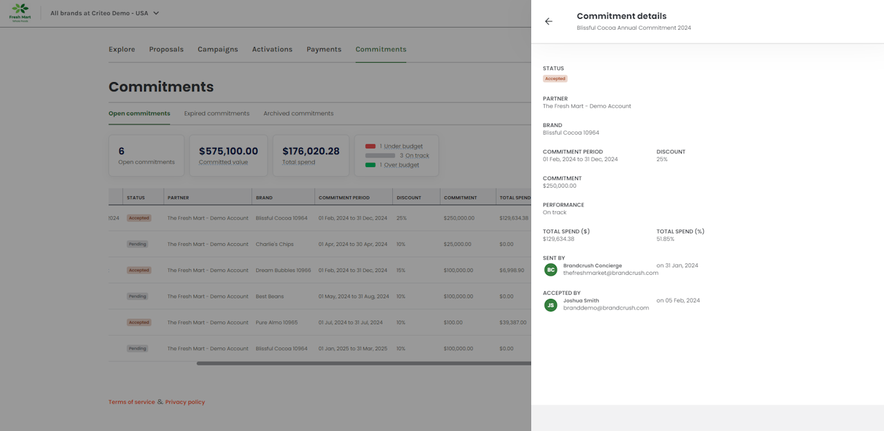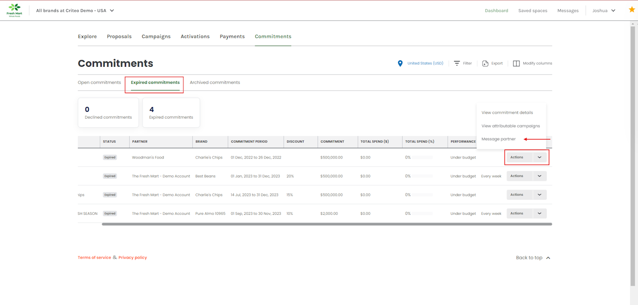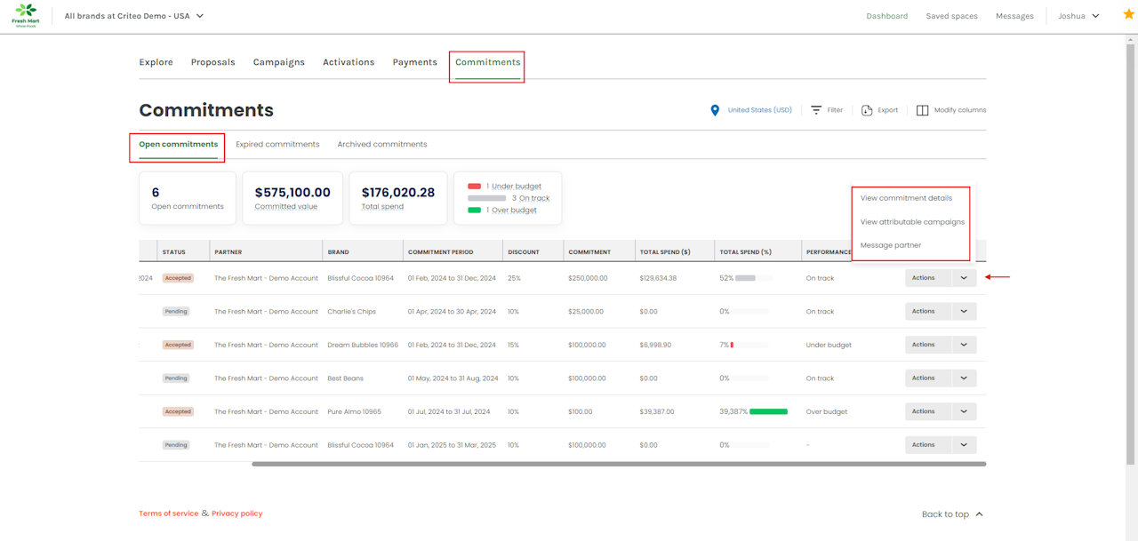 - Here you can accept or decline the commitment, View commitment details View attributable campaigns or Message partner.
