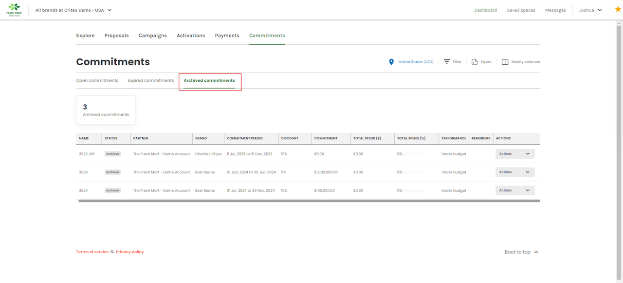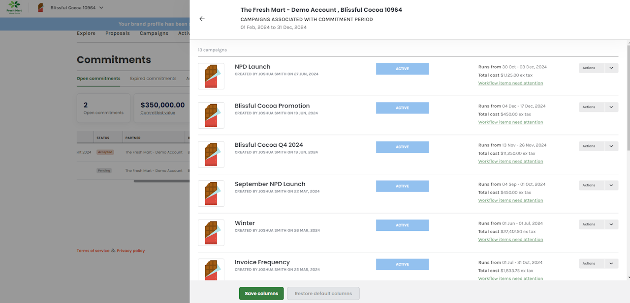 - Click the View attributable campaigns button to see what campaigns are associated with the commitment.