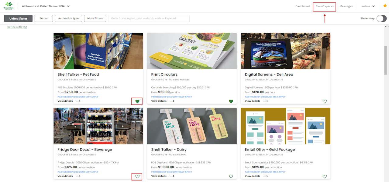 - You can view all your saved media spaces, where you can sort by: Recommended, Rate and Product reach.