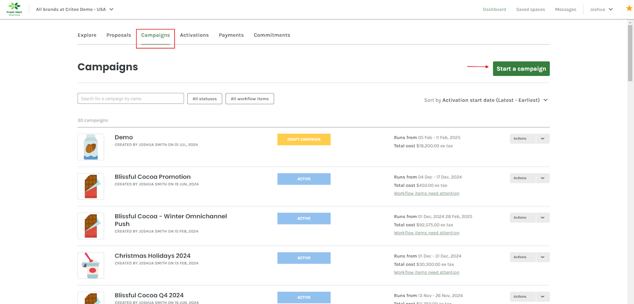 - From the Campaigns tab, click on Start a campaign.