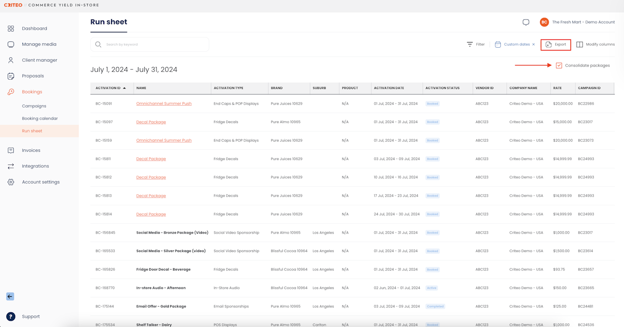 - Columns include Spaces, Packages, Campaign IDs, Delivery Dates, Suburbs, and more.
