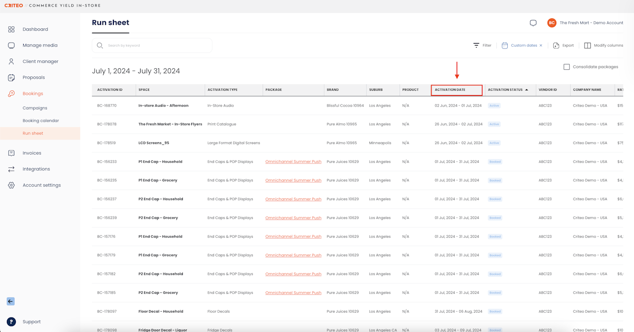 - In this example, the Run Sheet is sorted by Activation Dates, newest to oldest, as indicated by the arrow above the column.