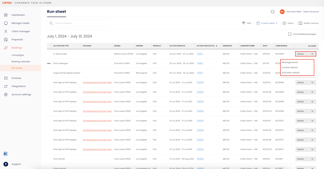 - Click the Actions dropdown menu on an activation to message brand, view contact or activation details.