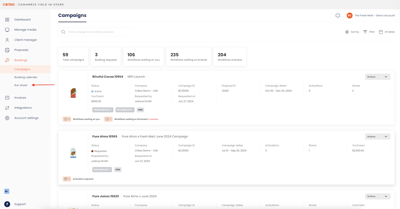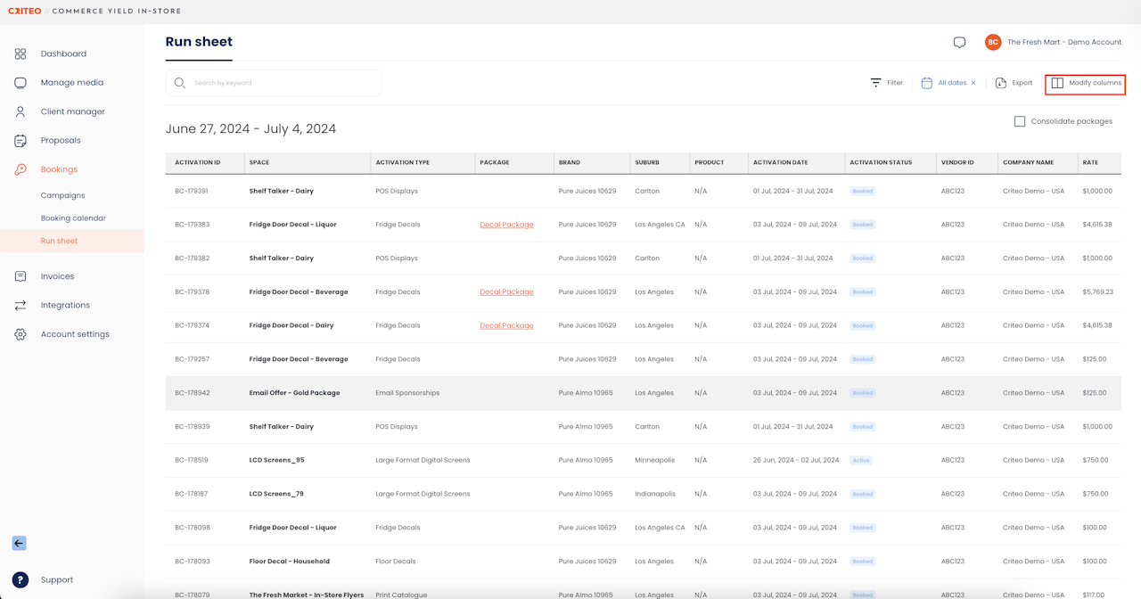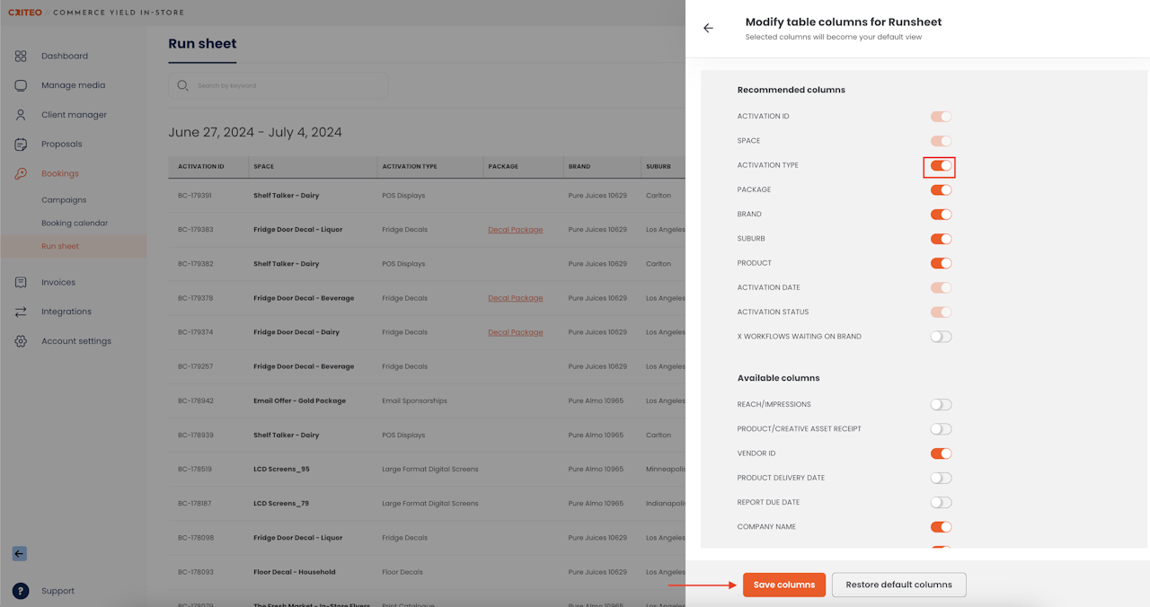 - Add & remove columns from your Run Sheet by clicking Modify columns.