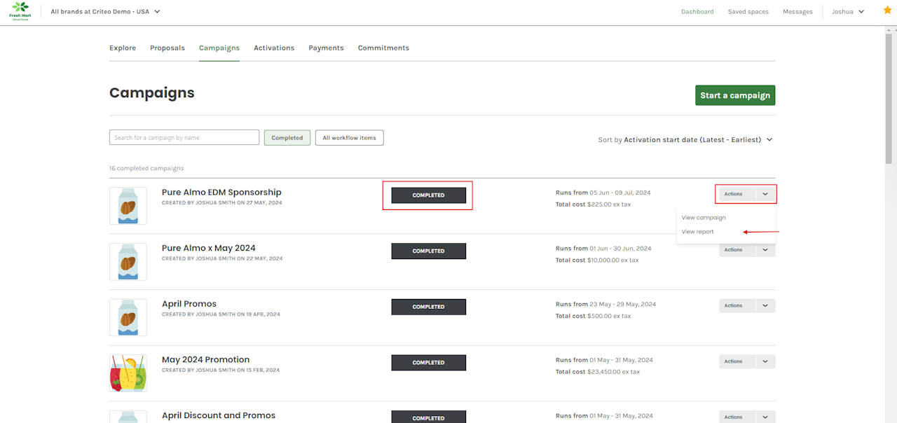 - Find the relevant Campaign, click the Actions dropdown menu and View report.